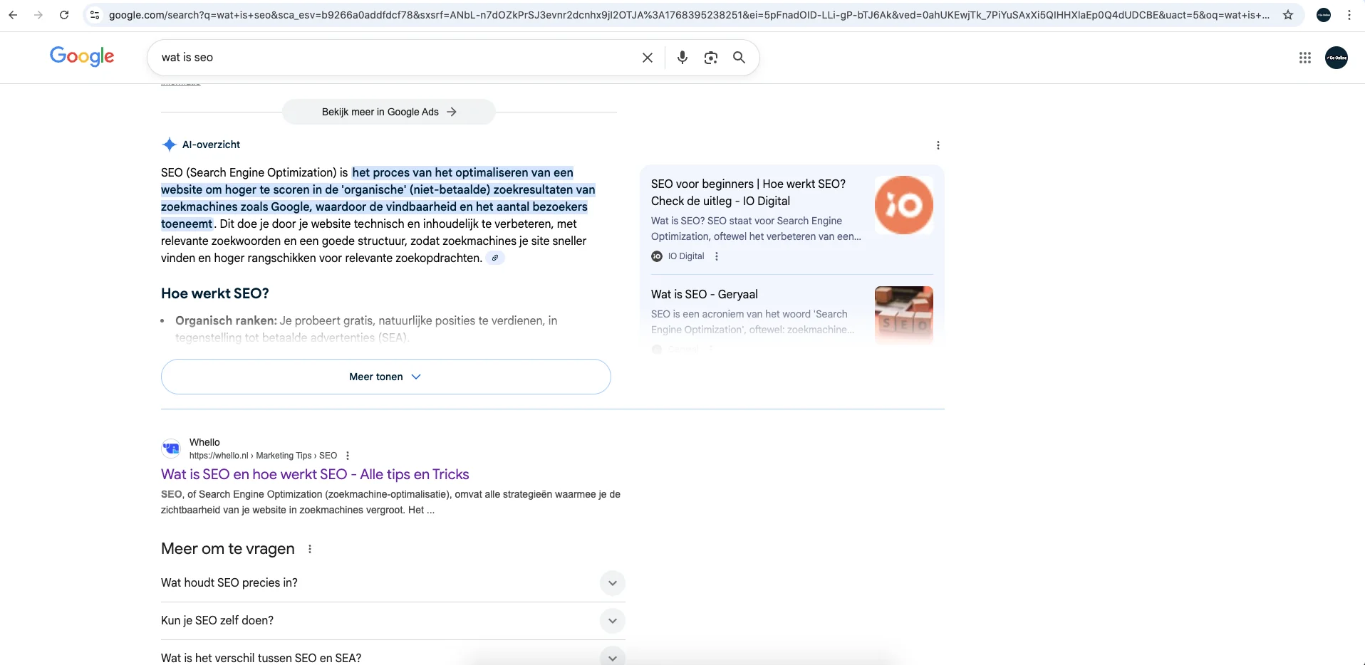 Daarbij is de zoekintentie veranderd. Veel mensen gebruiken Google als een soort assistent voor korte, praktische vragen. Dat zijn precies de momenten waarop Google probeert het antwoord meteen te tonen.