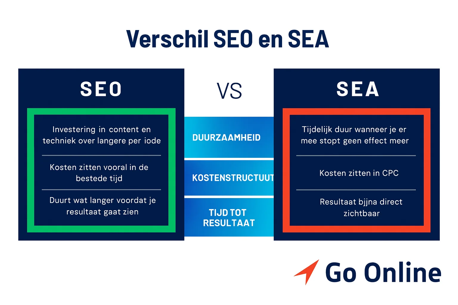 SEO is op de lange termijn vaak goedkoper per bezoeker, omdat posities behouden blijven, ook als je tijdelijk minder actief bent. SEA is ideaal voor directe zichtbaarheid, maar verdwijnt zodra de campagne stopt. Bekijk de infographic hieronder voor een duidelijk overzicht.