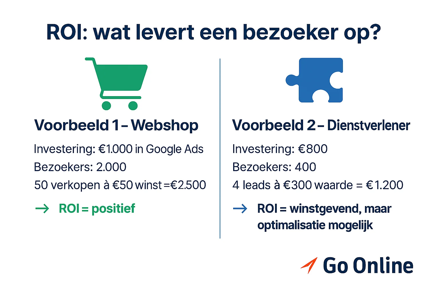 Als een bezoeker gemiddeld €50 oplevert en je betaalt €2 per bezoeker, dan is de ROI als volgt: