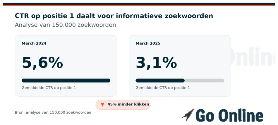 Google toont vaker AI Overviews en experimenteert met AI Mode. Daardoor kan een deel van de informatie al beantwoord worden voordat iemand doorklikt. Dat betekent niet dat SEO minder belangrijk is, maar wel dat je content duidelijker moet aansluiten op echte vragen, met heldere structuur en bewijs van expertise. Dat effect zie je ook terug in de data analyse van Ahrefs: Ahrefs analyseerde 300.000 zoekwoorden en vergeleek een set met AI Overview met een vergelijkbare set informatieve zoekwoorden zonder AI Overview. Op basis van geaggregeerde Google Search Console data (desktop CTR) concluderen zij dat de aanwezigheid van AI Overviews samenhangt met een circa 34,5% lagere gemiddelde klikratio voor de nummer 1 positie. Google beschrijft zelf hoe AI features en AI Overviews linken tonen en kansen bieden voor site owners, maar de impact op verkeer kan per branche en type zoekopdracht verschillen.