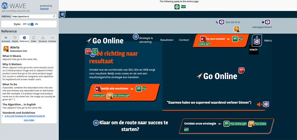 Er zijn diverse tools op het internet beschikbaar die het je in staat stellen om een “check” te doen. Een voorbeeld daarvan is de WAVE tool. Na het invoeren van je URL, krijg je een rapport waarin verschillende errors worden weergegeven. Per error wordt er tevens beschreven wat deze betekent, maar ook waarom het verbeteren van deze error ertoe doet. Zie onderstaande afbeelding. Voor een leek is dit natuurlijk een technisch verhaal. Wij raden het dan ook aan om je website te laten checken door een professional.